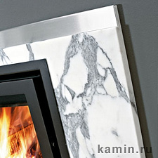 Каминная рамка из полированного бежевого Травертина с деталями из матовой нержавеющей стали.